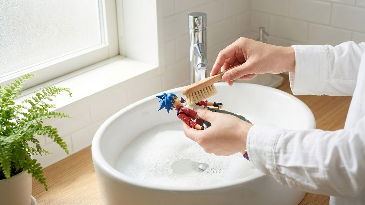 フィギュアを投入し、数時間〜半日ほど漬け置きます。ベタつきがひどい場合は、指の腹で優しく撫でるように洗いましょう。細かい隙間は、柔らかい筆を使うのがおすすめ。