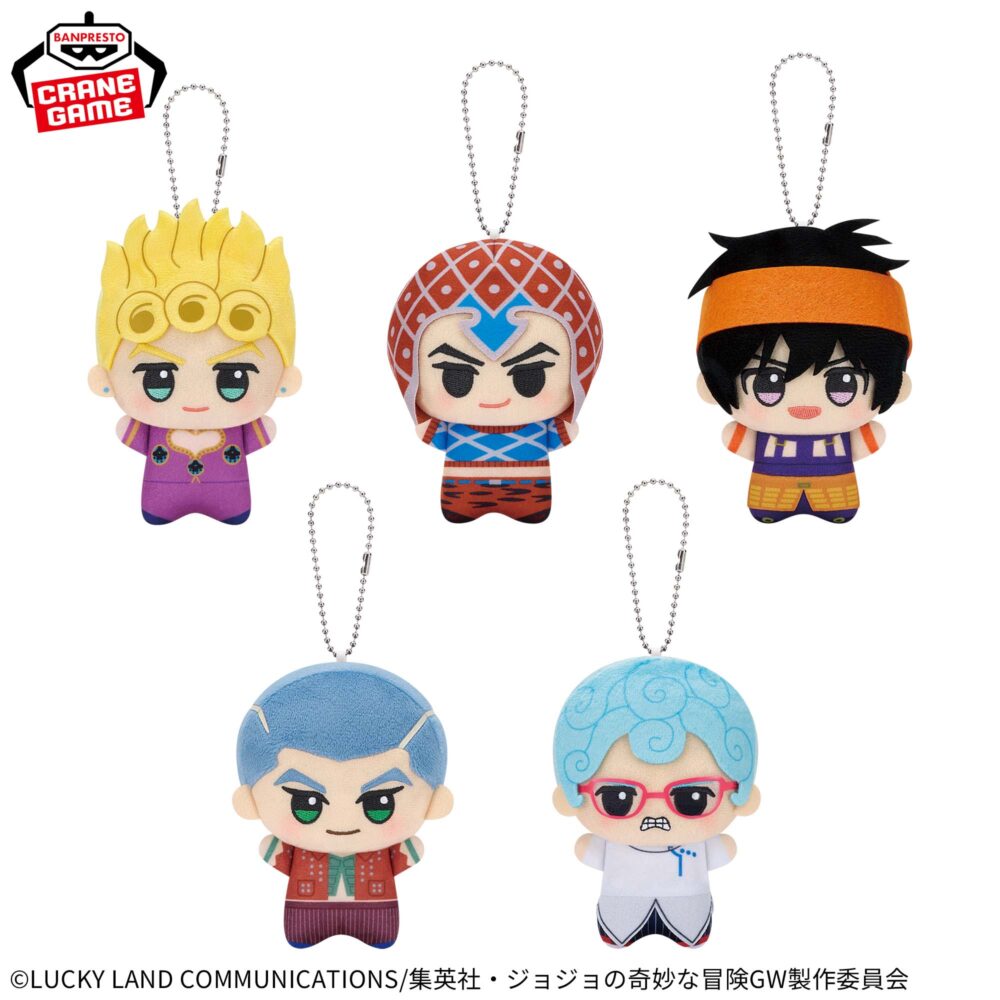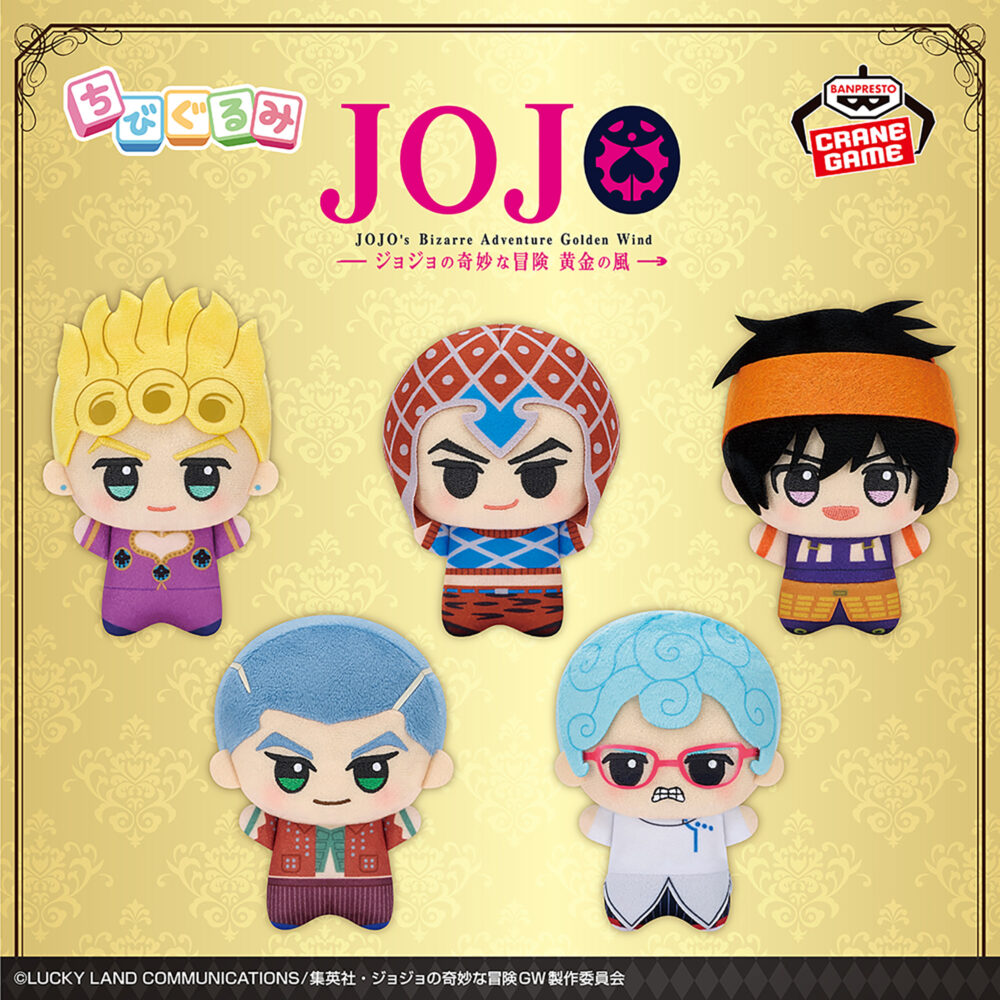 バンプレストが手掛ける大人気ぬいぐるみシリーズから、『ジョジョの奇妙な冒険 黄金の風』のキャラクターたちがついに展開されます。デフォルメされた可愛らしい姿が特徴的な、ファン必見のアイテムです。
